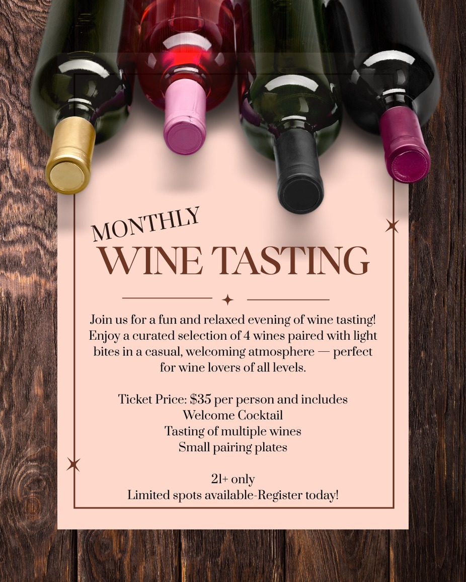 Join us for our monthly wine tasting event! Enjoy a curated selection of wines paired with light bites in a fun, relaxed atmosphere. Whether you’re a casual sipper or a true wine enthusiast, this is the perfect way to discover new favorites and spend an evening with friends.